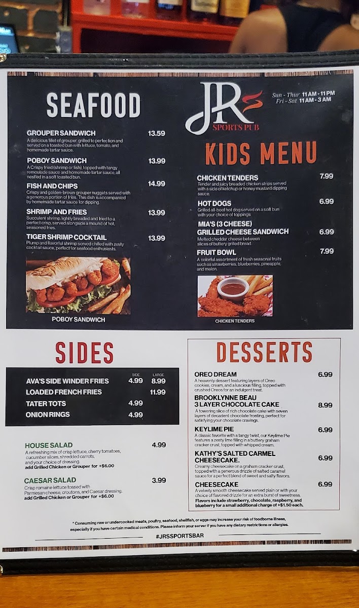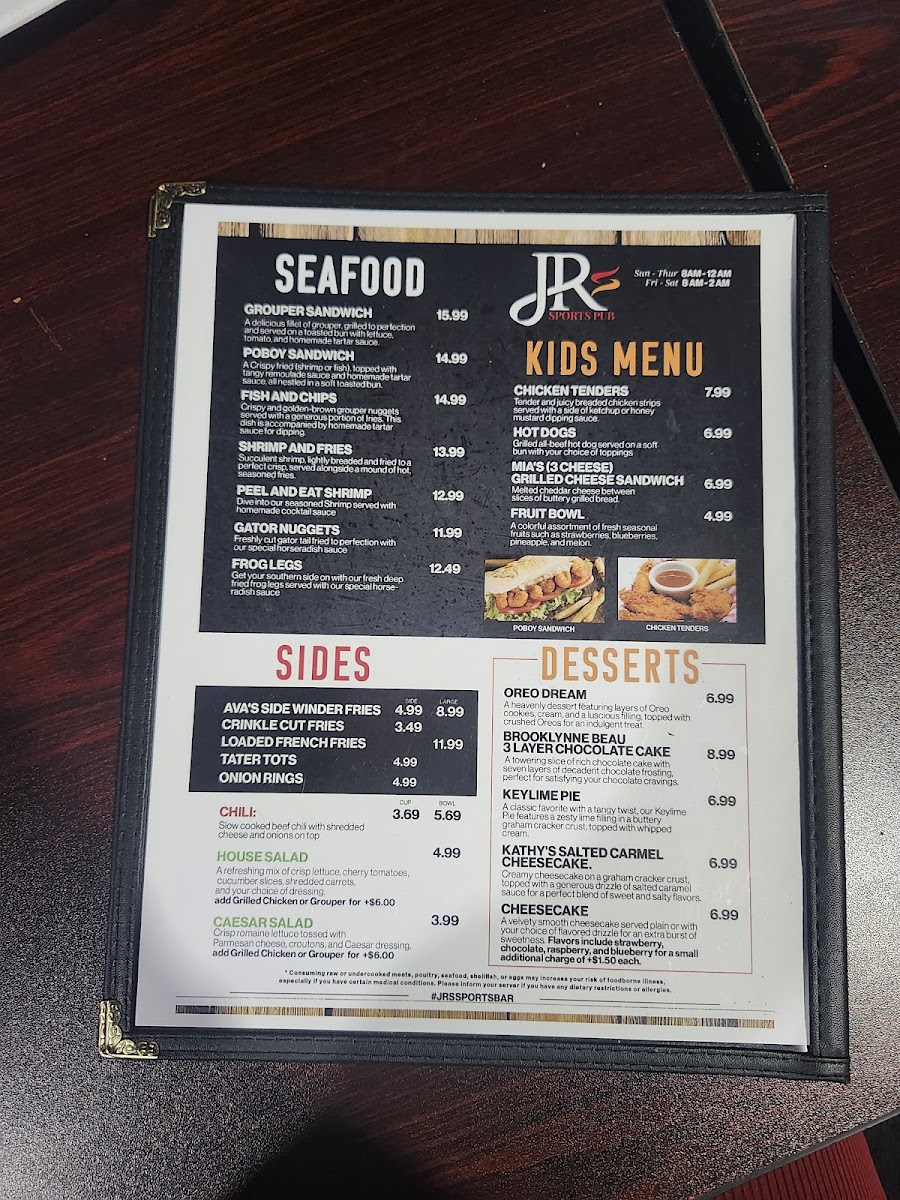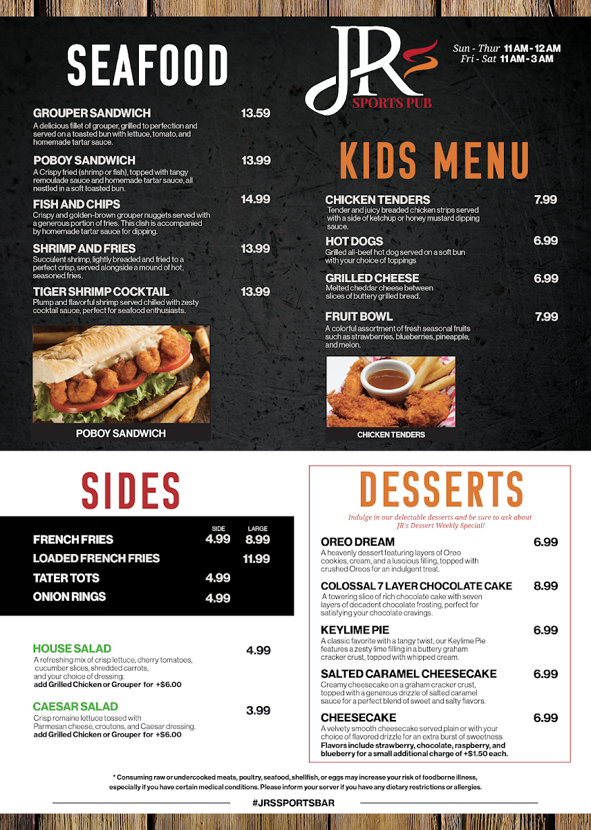 Introducing the menu at JR's Sports Pub, located at 5858 Roosevelt Blvd, Clearwater, FL, is a culinary journey worth embarking on. Specializing in a diverse range of offerings, the menu features mouthwatering starters and wings, hearty burgers and sandwiches, and delightful seafood options that satisfy both casual diners and sports enthusiasts alike. Guests rave about the Grouper sandwich, described as the best they’ve ever had, while the chicken wings are a must-try, known for their perfect seasoning.